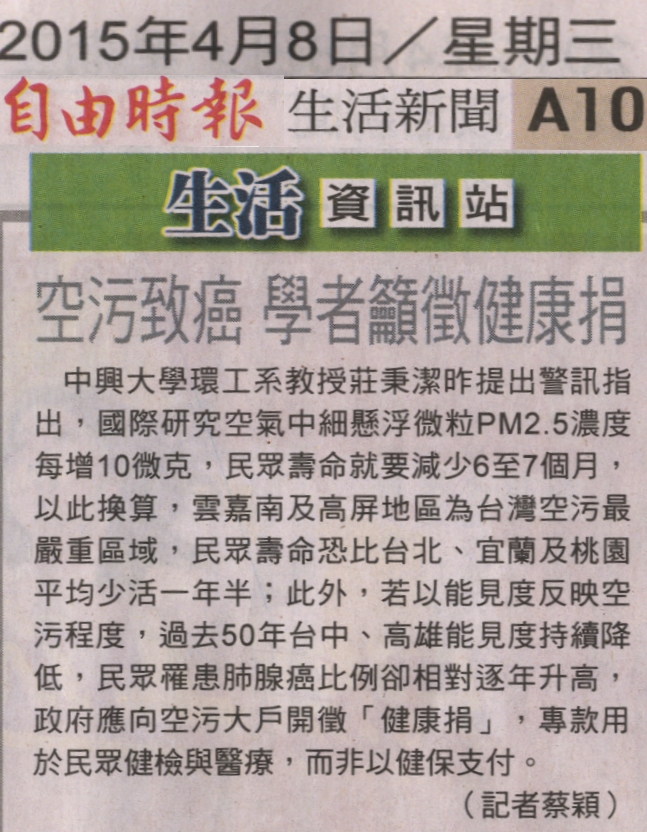 【媒體報導】空污致癌 學者籲徵健康捐
