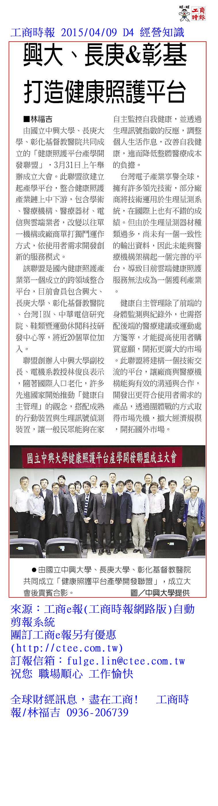 由國立中興大學、長庚大學、彰化基督教醫院共同成立的「健康照護平台產學開發聯盟」,3月31日上午舉辦成立大會。此聯盟欲建立起產學平台,整合健康照護產業鏈上中下游,包含學術、醫療機構、醫療器材、電信與雲端業者,改變以往單一機構或廠商單打獨鬥運作方式,依使用者需求開發創新的服務模式。
