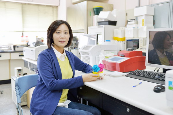 興大生科系教授洪慧芝發現黑色素細胞瘤生長轉移的關鍵因子,圖中她展示人類粒線體蘋果酸之結構模型。
