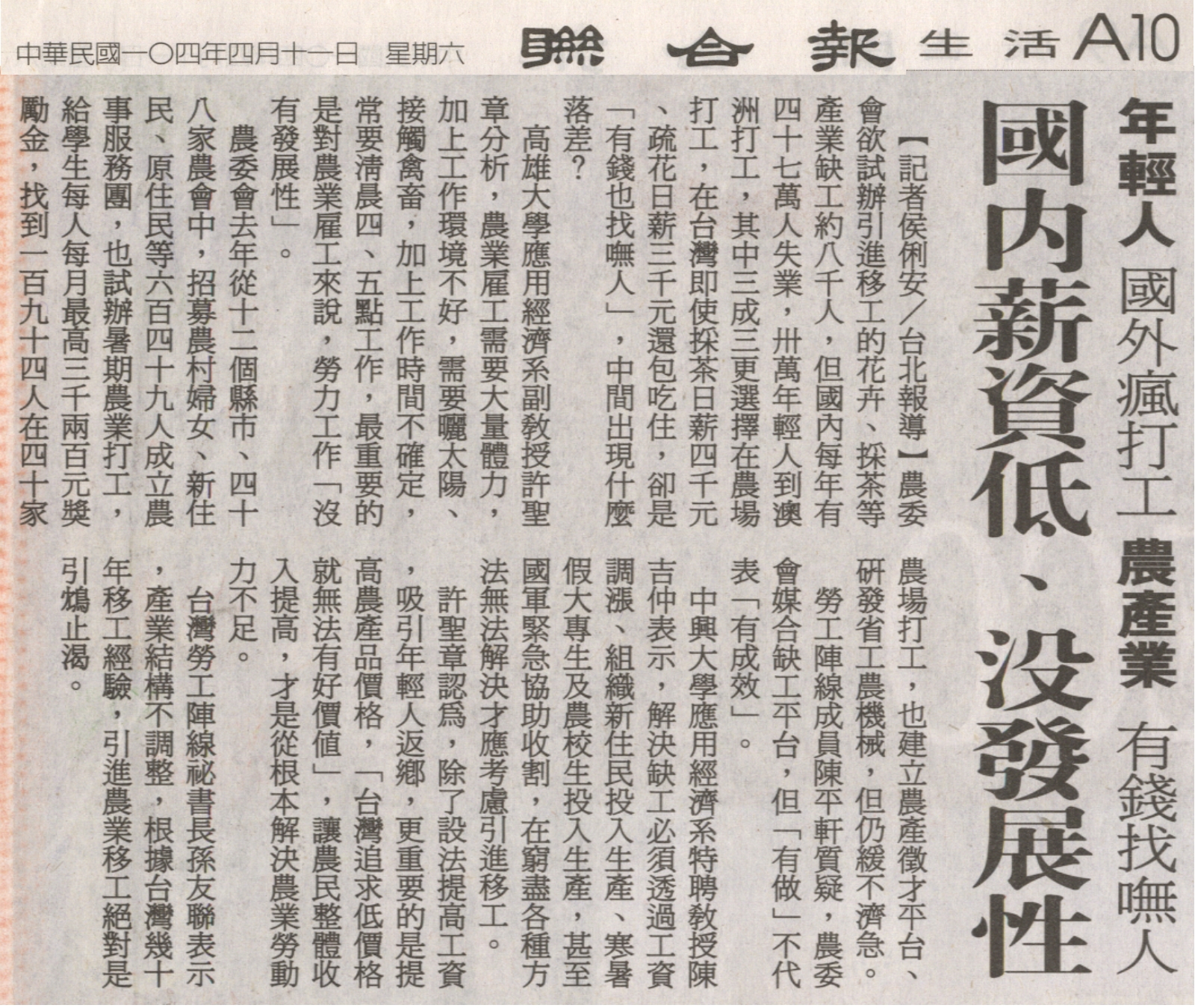 農委會欲試辦引進移工的花卉、採茶等產業缺工約八千人,但國內每年有四十七萬人失業,卅萬年輕人到澳洲打工,其中三成三更選擇在農場打工,在台灣即使採茶日薪四千元、疏花日薪三千元還包吃住,卻是「有錢也找嘸人」,中間出現什麼落差?