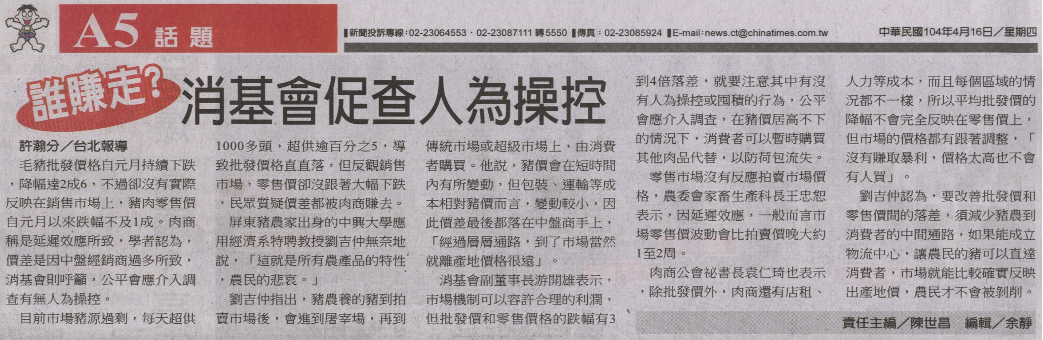 陳吉仲指出,豬農養的豬到拍賣市場後,會進到屠宰場,再到傳統市場或超級市場上,由消費者購買。他說,豬價會在短時間內有所變動,但包裝、運輸等成本相對豬價而言,變動較小,因此價差最後都落在中盤商手上,「經過層層通路,到了市場當然就離產地價格很遠」。