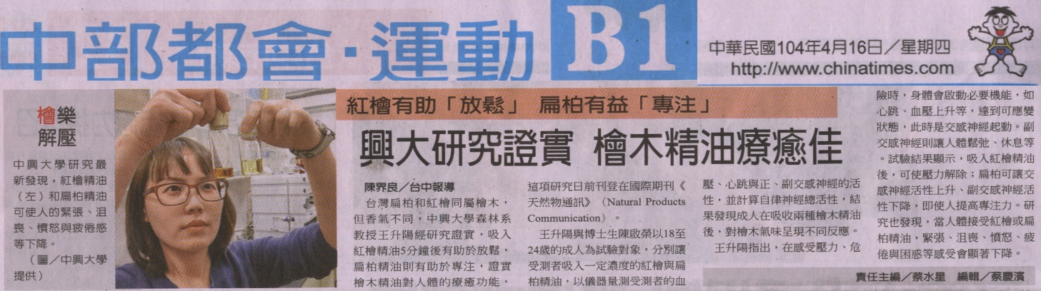 【媒體報導】興大研究證實 檜木精油療癒佳 紅檜有助「放鬆」 扁柏有益「專注」