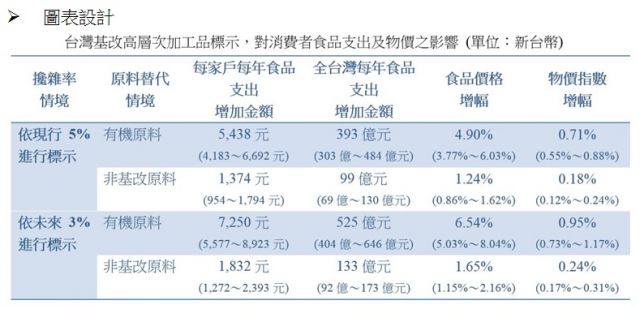 據台經院研究顯示,國內非基改黃豆及玉米為基改價格的1.2~1.4倍,有機則為2~2.6倍;如未來基改高層次加工品進行標示,廠商改採非基改或有機原料後,初步估計每個家庭每年食品支出增加金額最高將達8,923元,全台每年食品支出增加金額最高將達646億元,食品價格增幅最高將達8.04%。高層次加工品廣泛存在於醬油、黃豆油、玉米油、玉米糖漿、玉米澱粉等大宗食品原料,市面上高層次加工品之基改標示宜審慎,以避免相關業者成本與消費者食品支出增加,甚至影響台灣貿易。