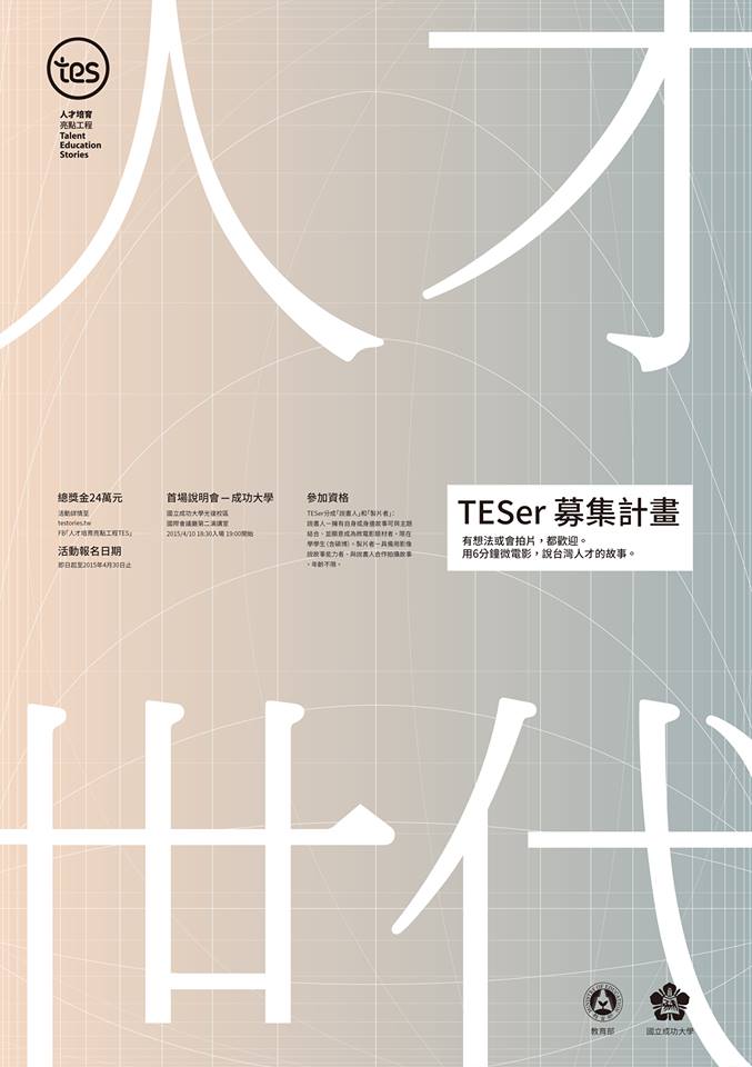 徵求TESer製片者與TESer說書人。TESer製片者身分年齡不限,具備拍片或者劇組條件即可;TESer說書人限大專院校在學學生(含碩博生),且能夠提供自身與四大主題相關故事者。