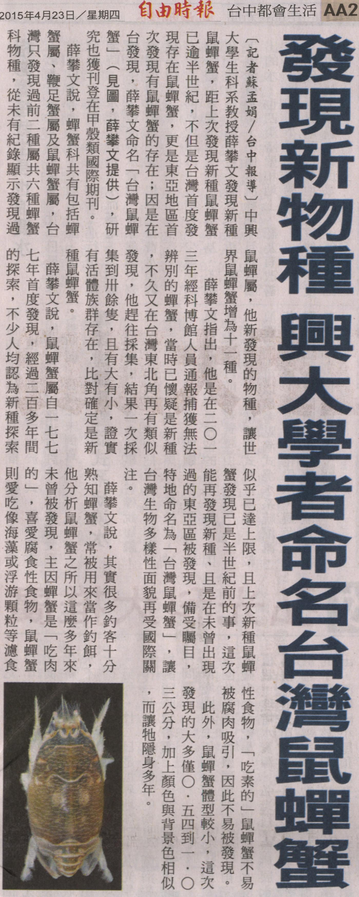 中興大學生科系教授薛攀文發現新種鼠蟬蟹,距上次發現新種鼠蟬蟹已逾半世紀,不但是台灣首度發現存在鼠蟬蟹,更是東亞地區首次發現有鼠蟬蟹的存在;因是在台發現,薛攀文命名「台灣鼠蟬蟹」,研究也獲刊登在甲殼類國際期刊。