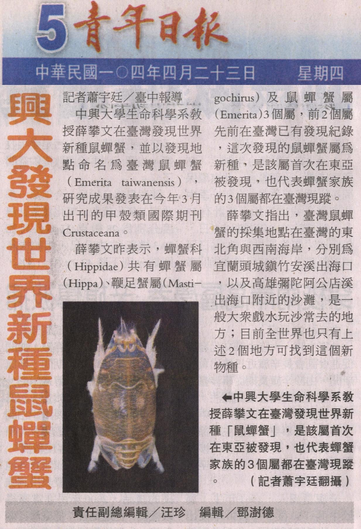 【媒體報導】興大發現世界新種鼠蟬蟹