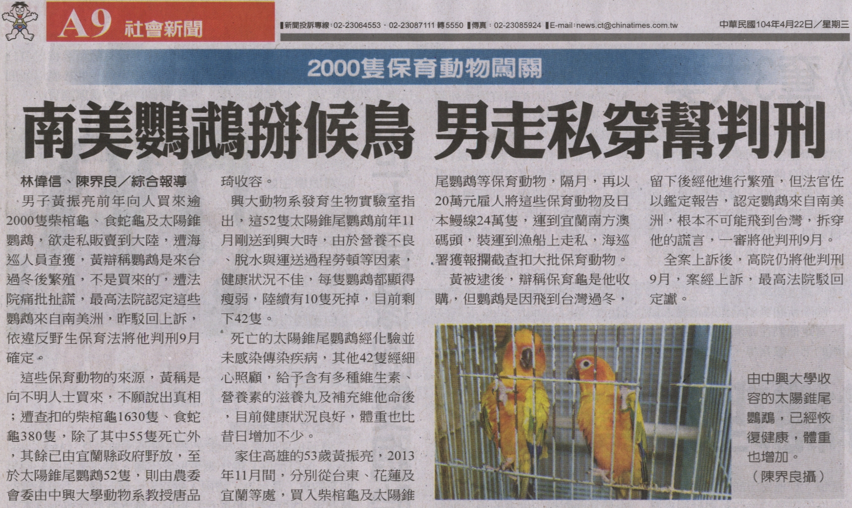 男子黃振亮前年向人買來逾2000隻柴棺龜、食蛇龜及太陽錐鸚鵡,欲走私販賣到大陸,遭海巡人員查獲,黃辯稱鸚鵡是來台過冬後繁殖,不是買來的,遭法院痛批扯謊,最高法院認定這些鸚鵡來自南美洲 ,昨駁回上訴,依違反野生保育法將他判刑9月確定。