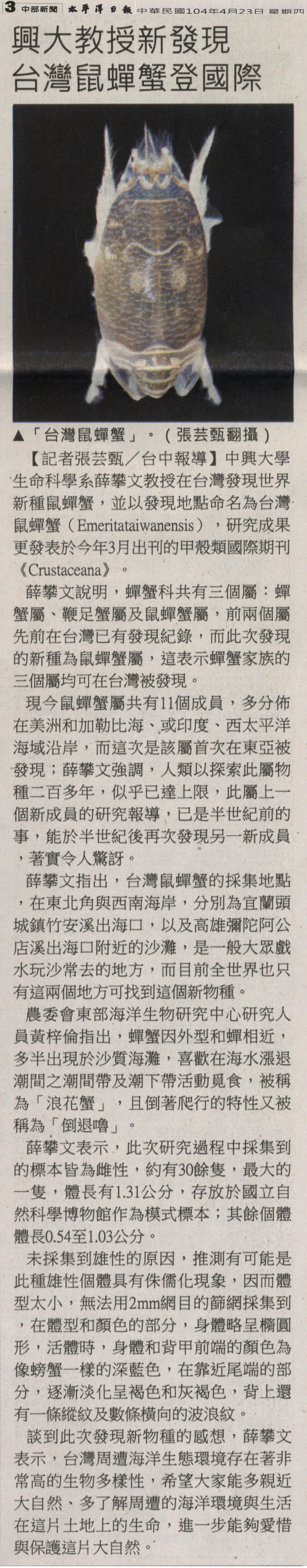中興大學生命科學系薛攀文教授在台灣發現世界新種鼠蟬蟹,並以發現地點命名為台灣鼠蟬蟹(Emeritataiwanensis),研究成果更發表於今年3月出刊的甲殼類國際期刊《Crustaceana》。