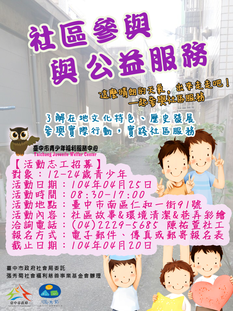 - 相關附件 社區參與-彩繪巷弄海報.jpg 、 社區參與與公益服務活動報名表.docx