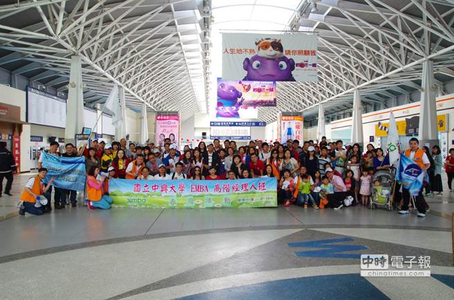 中興大學EMBA在校生及校友們,今(26)日搭乘台鐵微笑號(EMU800型)列車,來一趟不一樣的中、北部春遊之旅,大夥們在搭車前,拍團體照留念。 中興大學校長李德財伉儷(前排由右到左)、管理學院院長王精文伉儷,及EMBA執行長林金賢伉儷等人,今日都撥空親自參加興大EMBA在校生與校友們搭乘台鐵微笑號(EMU800型)列車活動。(後排由右到左),興大EMBA校友會理事長楊連發,102屆EMBA會長藍宏仁,及103屆EMBA會長陳明章。 |