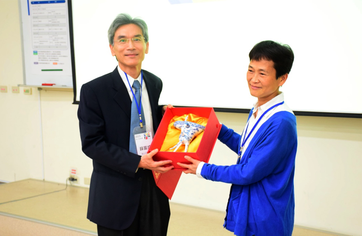 交大洪瑞雲教授(右)代表計畫,致贈禮品與興大工學院 薛富盛院長。