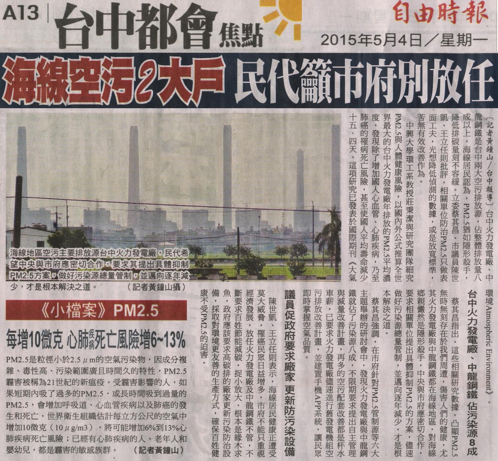 台中火力發電廠、中龍鋼鐵是台中兩大空污排放源,佔整體排放量八成以上。海線居民認為,PM2.5猶如隱形殺手,降低排碳量刻不容緩。立委蔡其昌、市議員陳世凱、王立任則批評,相關單位防治PM2.5只做表面工夫,光想降低偵測的數據,或是放寬標準,苦無有效改善作為。
