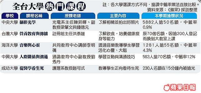 各大學都有每學期被學生瘋狂搶修的熱門課程,《蘋果》蒐羅全台各大學採訪五大夯課,都因內容有料、教師授課有魅力受歡迎,中央大學「攝影光學」通識課透過理論和實務教學生拍照,吸引近6000人要搶50個名額,中籤率不到1%;成功大學「從醫學看生死」課程,230個名額15分鐘內被搶光。有學生說,許多大學生4年都未必能選上夯課,比搶江蕙演唱會門票還難。