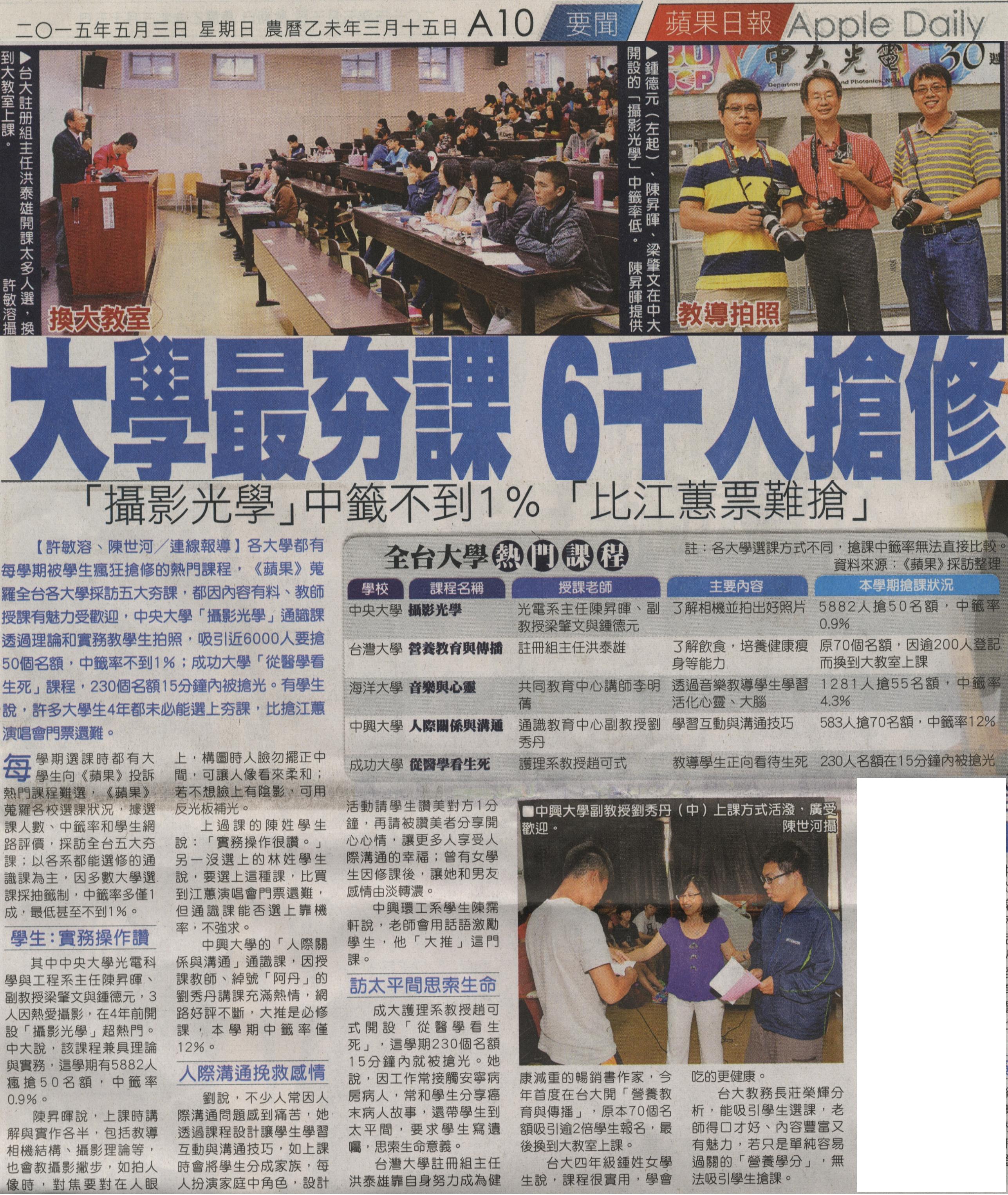 其中中央大學光電科學與工程系主任陳昇暉、副教授梁肇文與鍾德元,3人因熱愛攝影,在4年前開設「攝影光學」超熱門。中大說,該課程兼具理論與實務,這學期有5882人瘋搶50名額,中籤率0.9%。
