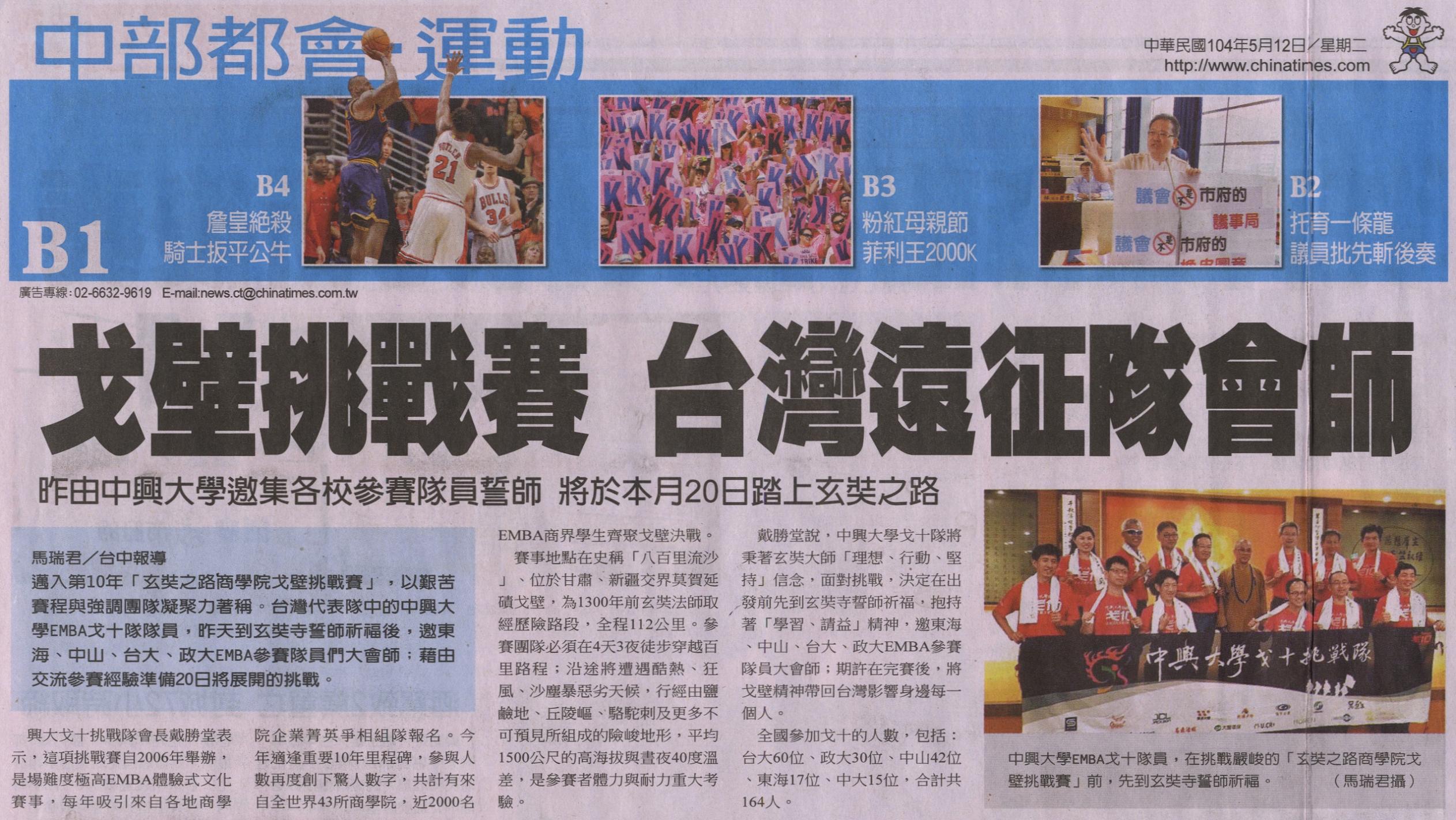 邁入第10年「玄奘之路商學院戈壁挑戰賽」,以艱苦賽程與強調團隊凝聚力著稱。台灣代表隊中的中興大學EMBA戈十隊隊員,昨天到玄奘寺誓師祈福後,邀東海、中山、台大、政大EMBA參賽隊員們大會師;藉由交流參賽經驗準備20日將展開的挑戰。