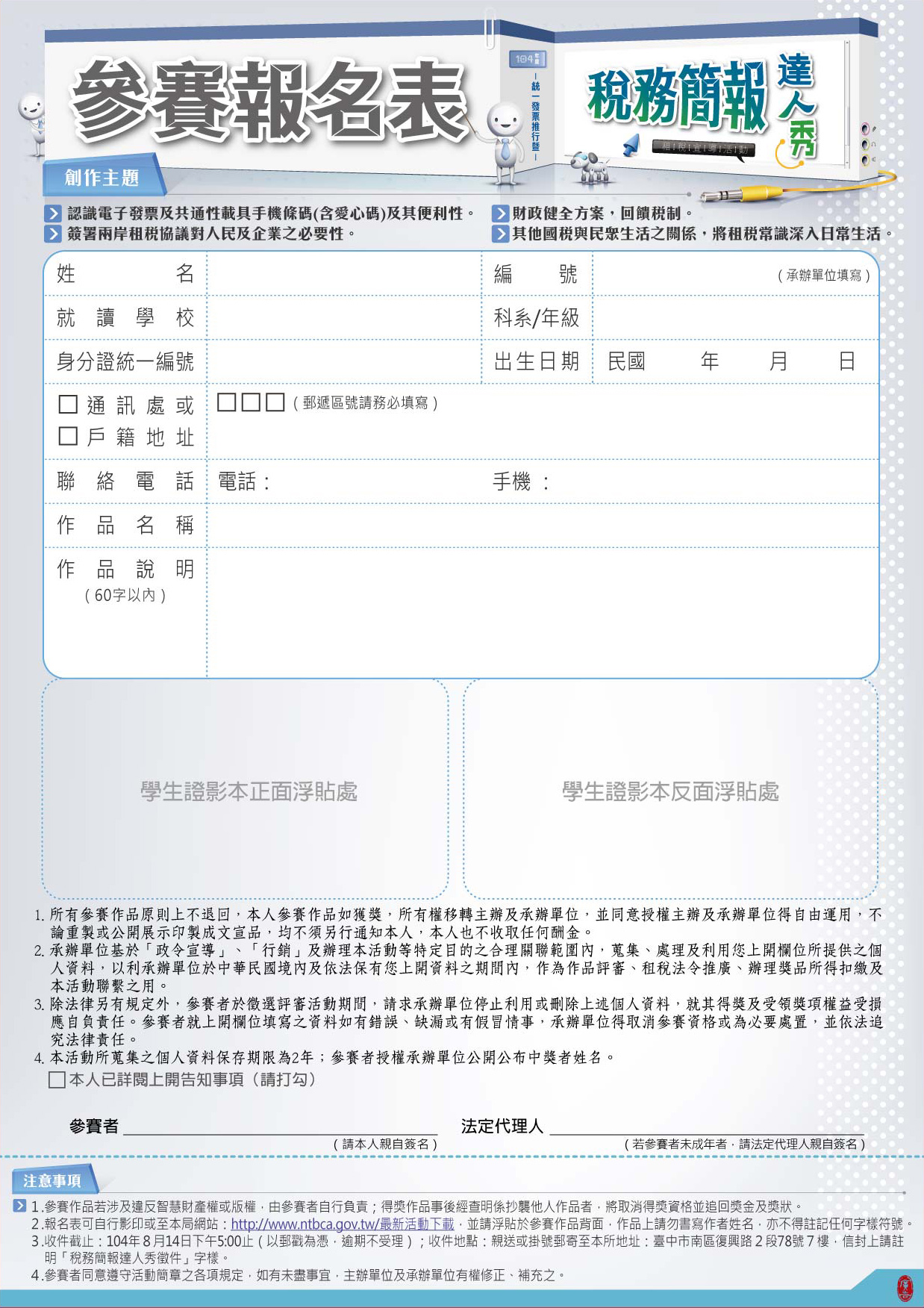 (1)報名表一份,內含簽署著作財產權授權使用同意書。參賽者可至中區國稅局網站(www.ntbca.gov.tw)詳閱活動相關訊息或下載簡章及報名表等事宜。