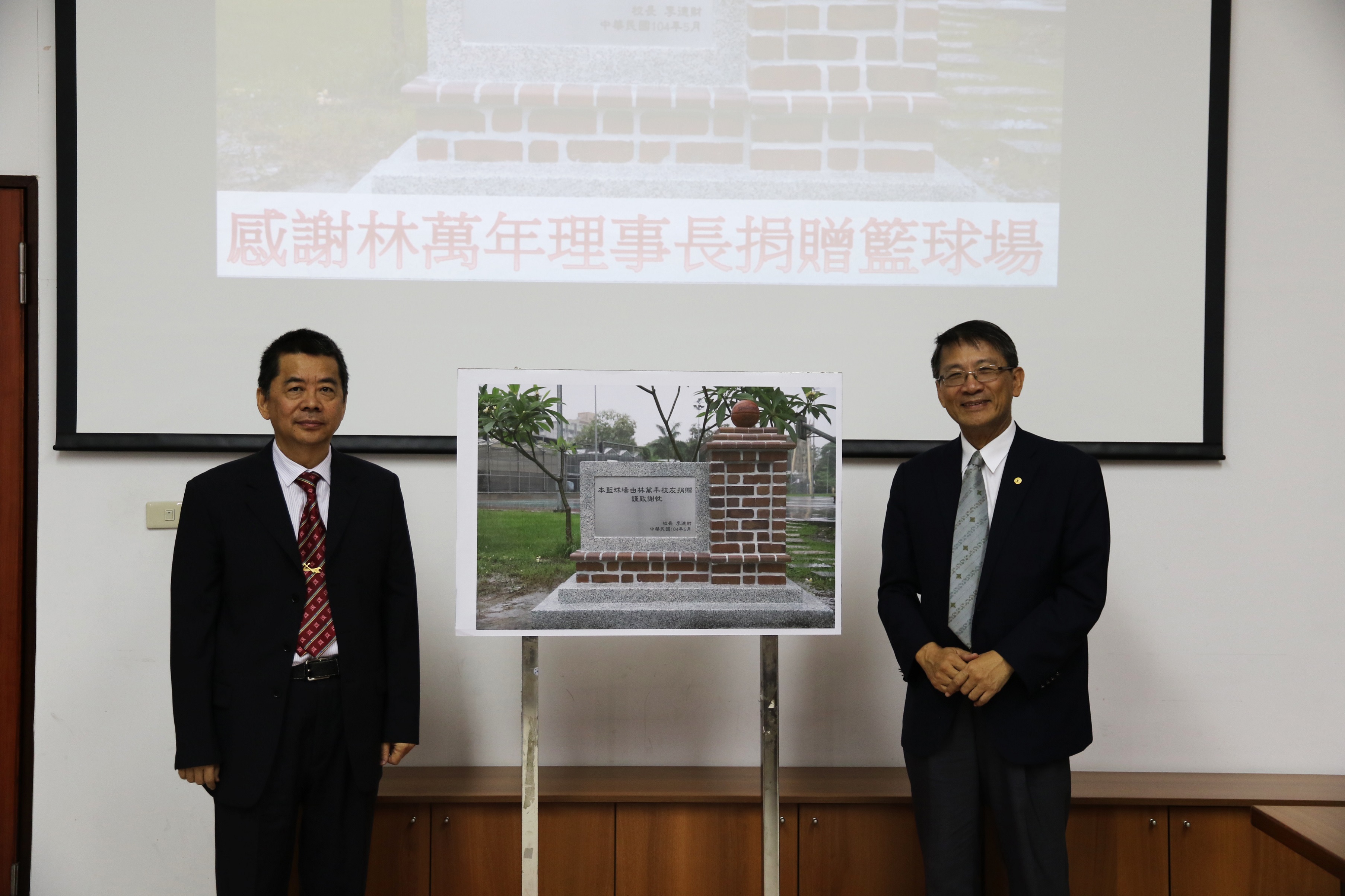 李校長表示,兩年多前規劃在舊籃球場現址興建多功能活動中心,為了不影響同學學習與運動的權益,在施工期間可以繼續打球,林理事長另外出資興建十面符合國際標準的替代球場,捐贈給學校使用。而為了響應林理事長為母校的付出,讓同學有更多辦理活動的場所,元大營造廠負責人錢聯興校友另外在球場旁捐建一座木質舞臺。李校長對兩位校友的付出表達由衷的感謝。