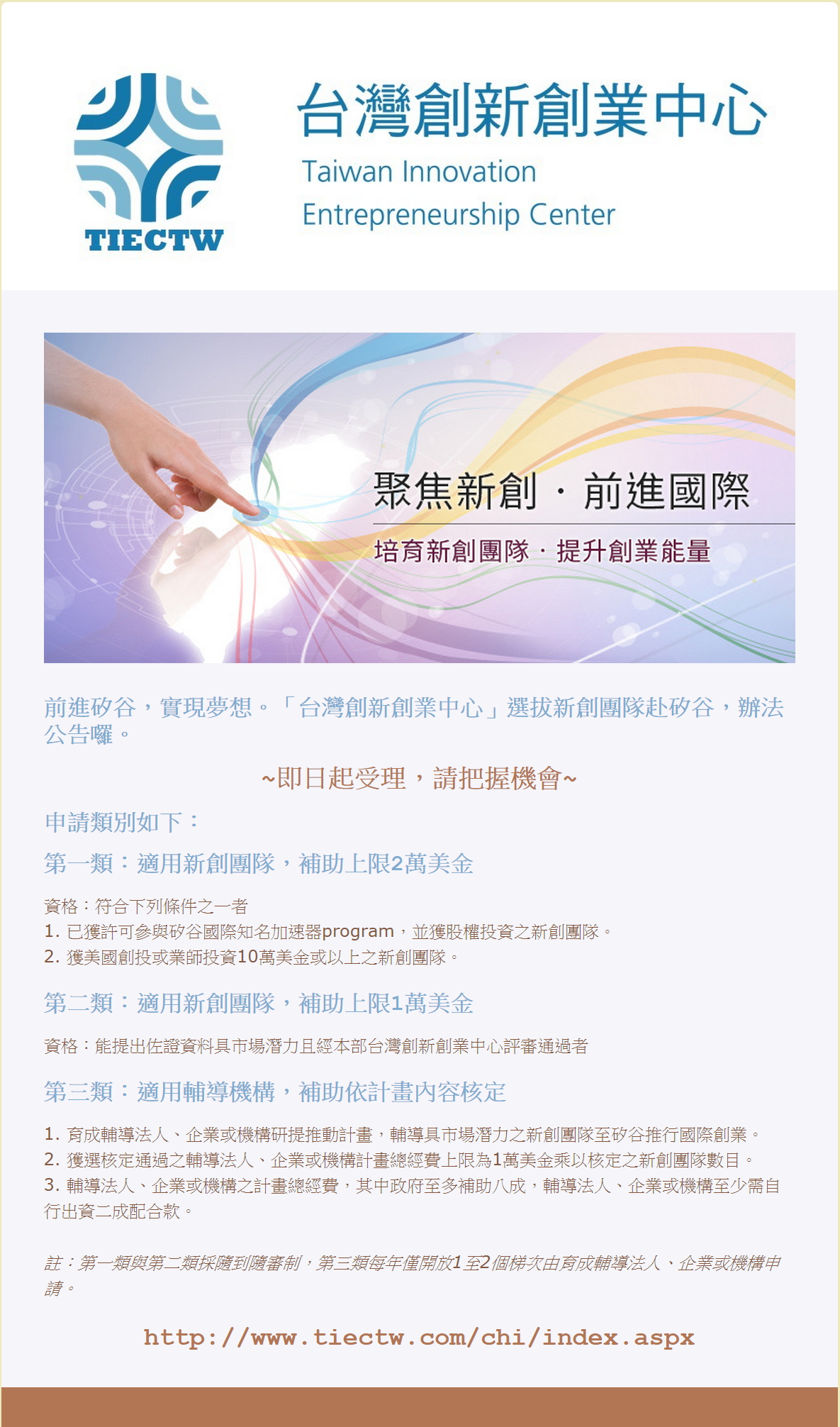 前進矽谷,實現夢想。「台灣創新創業中心」選拔新創團隊赴矽谷,辦法公告囉。