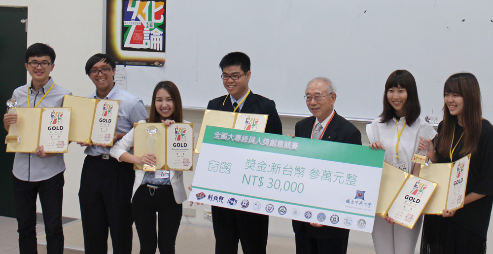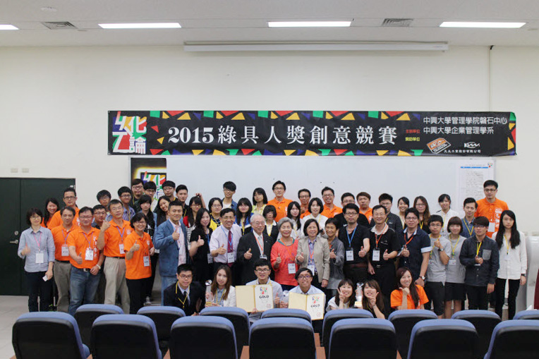 中興「鉅棒外交」、中興「ICT」、雲科「選擇性缺失」首獎合影。 久允工業趙世欽董事長(左)致贈禮品與興大管理學院王精文院長。 2015綠具人獎創意競賽決賽合影留念。