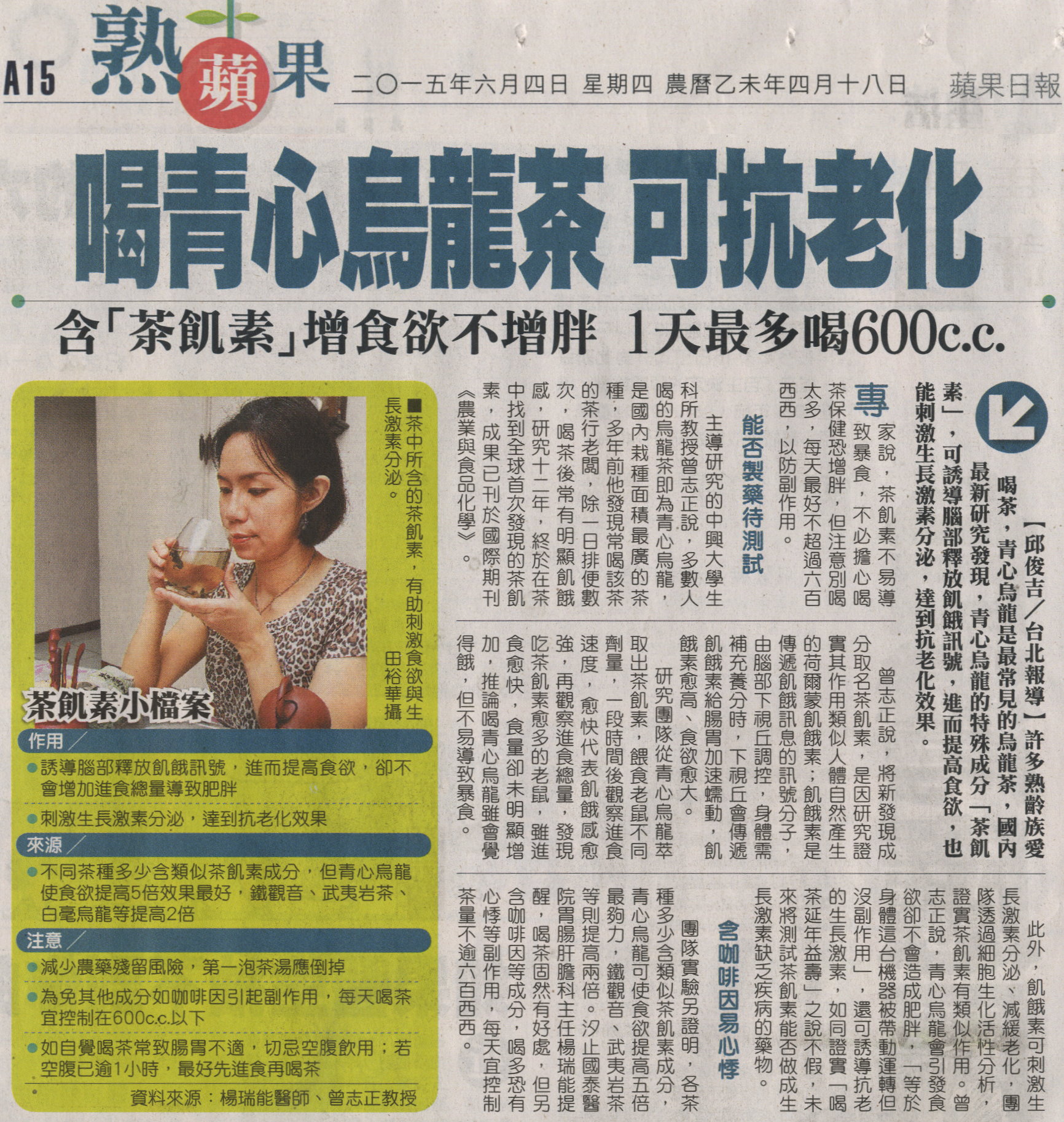 團隊實驗另證明,各茶種多少含類似茶飢素成分,青心烏龍可使食欲提高五倍最夠力,鐵觀音、武夷岩茶等則提高兩倍。汐止國泰醫院胃腸肝膽科主任楊瑞能提醒,喝茶固然有好處,但另含咖啡因等成分,喝多恐有心悸等副作用,每天宜控制茶量不逾六百西西。