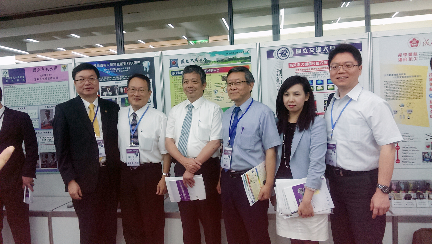 頂尖計畫記者會此次以「創新科技」為主題,從左至右為興大王國禎教授、呂曼麗秘書、洪慧芝執行長、教育部傅遠智專員、陳全木研發長、馮筱庭碩一生、董彥廷博三生。 從左至右台科大校長廖慶榮、王國禎教授、教育部政務次長陳德華、清大校長賀陳弘、教育部副司長馬湘萍、陳全木研發長。