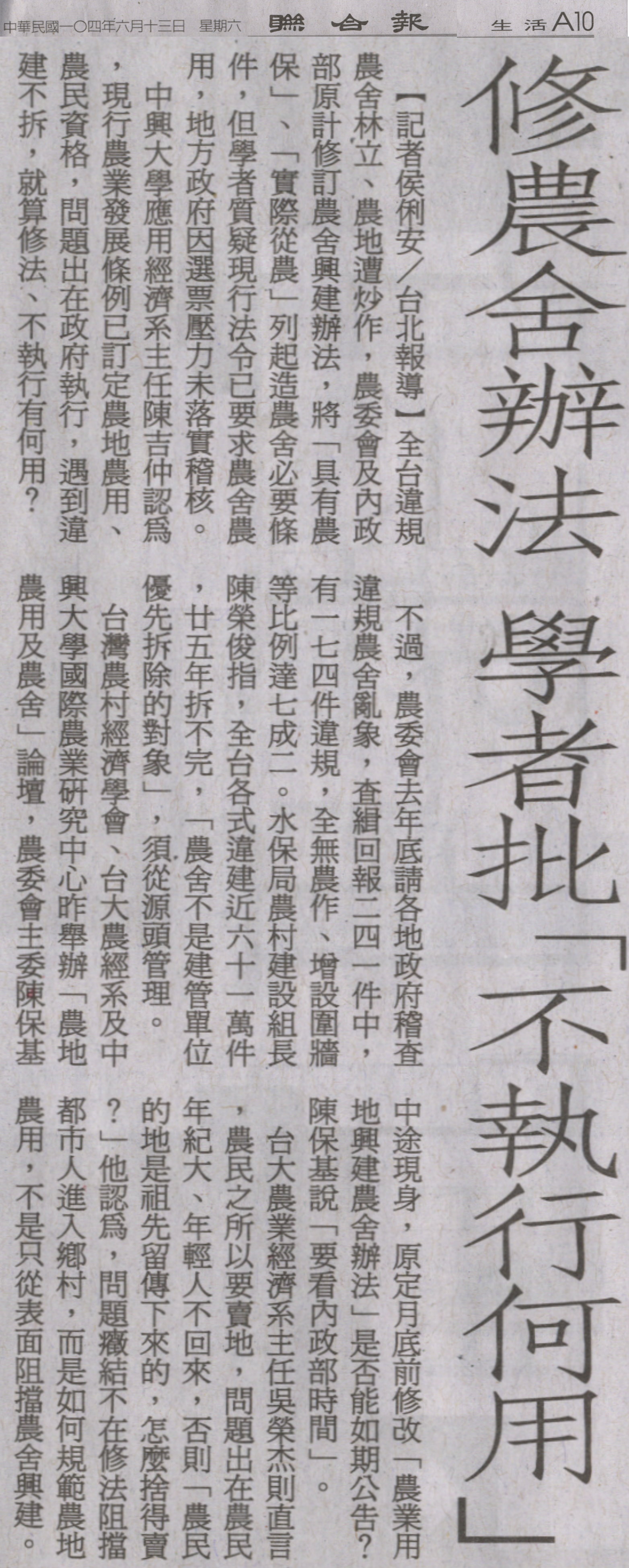 【媒體報導】修農舍辦法 學者批「不執行何用」