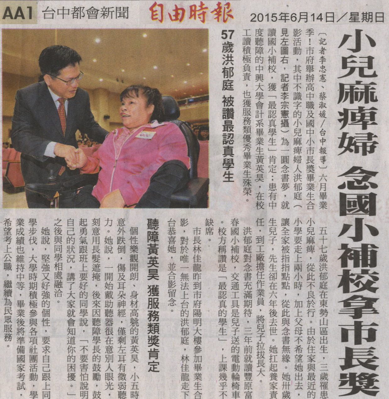 六月畢業季!市府舉辦高中職及國中小市長獎畢業生合影活動,其中不識字的小兒麻痺婦人洪郁庭為一圓念書夢,就讀國小補校,獲「最認真學生」肯定;患有中度聽障的中興大學會計系畢業生黃英昊,在校工讀積極負責,也獲服務類優秀畢業生殊榮。