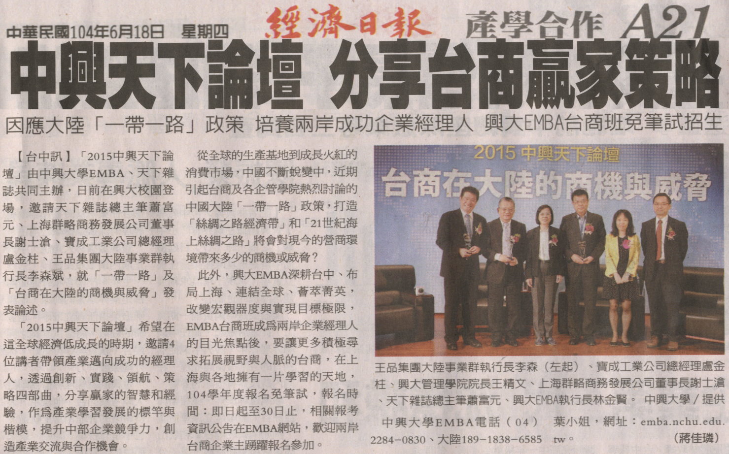 中興大學EMBA電話(04)2284-0830、大陸189-1838-6585葉小姐,網址:emba.nchu.edu.tw