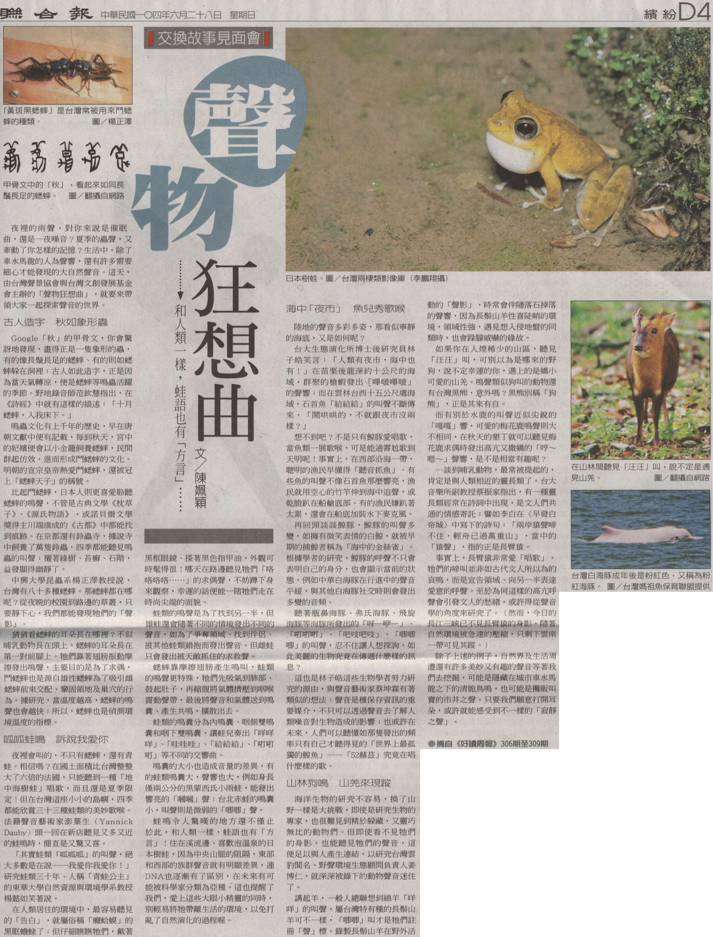 「其實蛙類『呱呱呱』的叫聲,絕大多數是在說──我愛你我愛你!」研究蛙類三十年、人稱「青蛙公主」的東華大學自然資源與環境學系教授楊懿如笑著說。