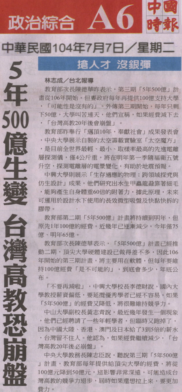 中央大學教務長陳志臣說,聽說第三期「5年500億」計畫,教育部每年提供給頂尖大學的經費,將從100億元降到50億元,這影響非常深遠,可能造成台灣高教的競爭力退步,屆時如果還想拉上來,要更加費力。
