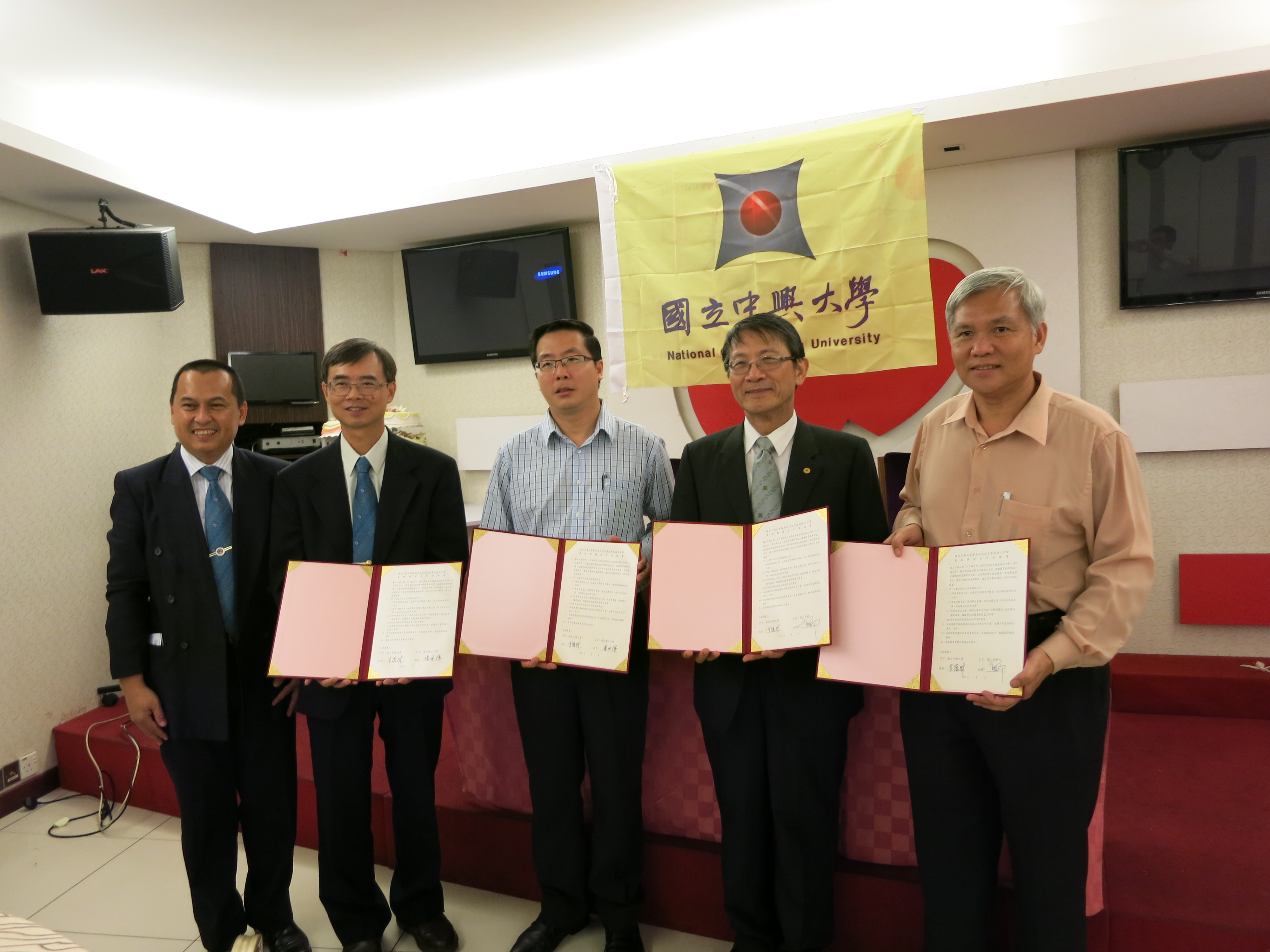 右至左:循人中學曾賢瑞校長、興大李德財校長、尊孔獨立中學潘永強校長、興大呂福興教務長、校友會蕭子鳴會長。 國立中興大學7月18日與檳吉8所獨中簽署合作協議書,成為合作夥伴學校,興大李德財校長(前排左2)、8月1日即將上任興大校長的工學院薛富盛院長(前排右1)與參與簽約儀式之貴賓合影。