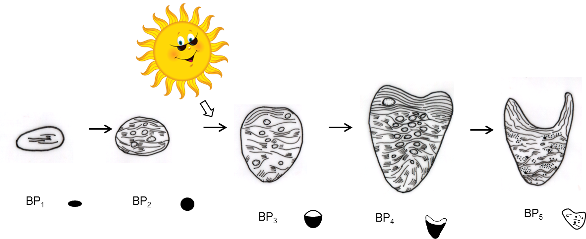二區葉綠體獨特的發育過程,其中第2時期 (BP2)需有低光的誘導上區才會分化出多層膜結構,至第4時期達成熟 (BP4),第5時期 (BP5) 已進入老化,光合作用功能逐漸失去。