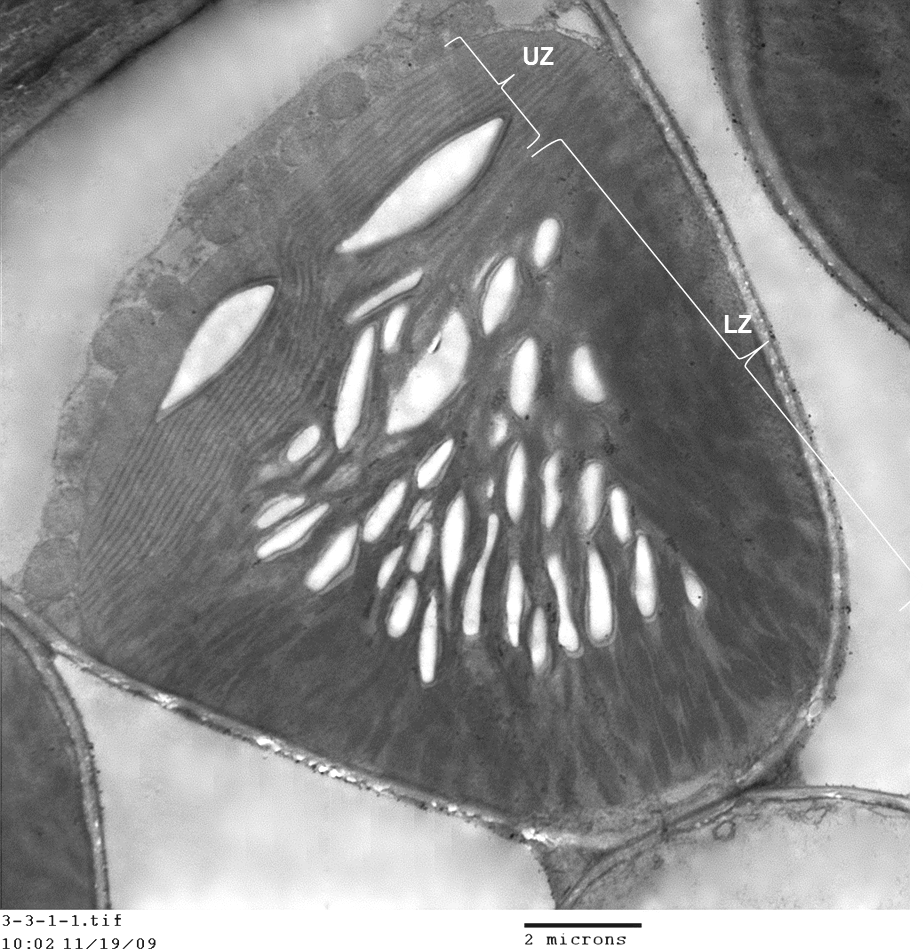二區葉綠體為植物界新發現的獨特葉綠體,呈杯狀且巨大,它位在漏斗形表皮細胞內。目前僅在卷柏這類原始的維管束植物內發現,這大而開展的杯狀葉綠體位表皮細胞的下方並為細胞間隙圍繞,此結構可增加捕捉林下有限光線的效率,是一種適應陰暗環境下特殊的葉綠體。圖為穿透式電子顯微鏡下所見的二區葉綠體,標UZ處為上區具多層膜結構,標LZ處為下區,其中的白點為光合作用的產物---澱粉粒。 卡通版的二區葉綠體,示其捕捉光子行光合作用 (許秋容繪)。