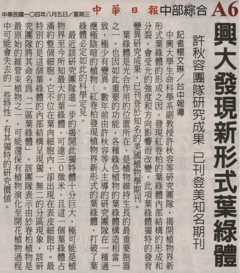 【媒體報導】興大發現新形式葉綠體