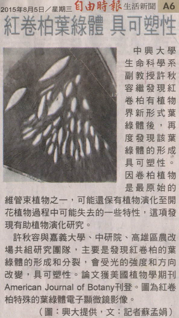 【媒體報導】紅卷柏葉綠體 具可塑性