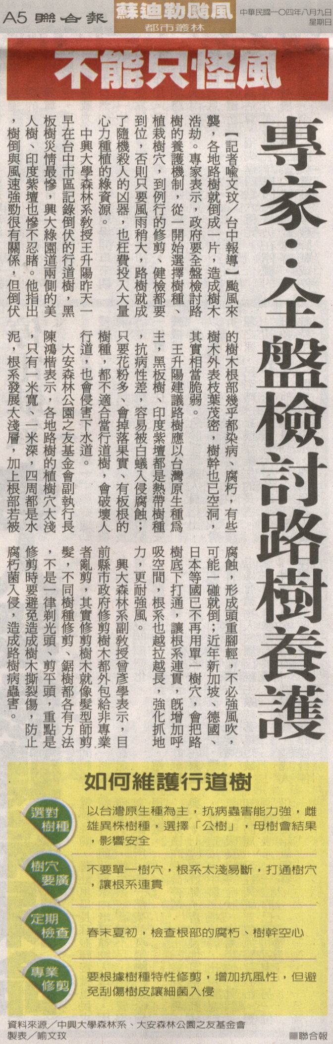 稿源:2015-08-09/聯合報/A5/蘇迪勒颱風都市叢林/喻文玟/台中