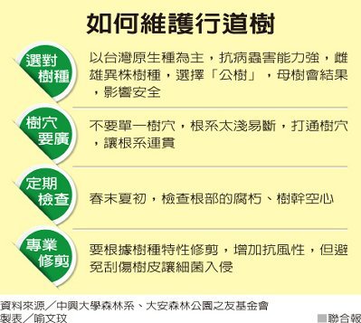 大安森林公園之友基金會副執行長陳鴻楷表示,各地路樹的植樹穴太淺,只有一米寬、一米深,四周都是水泥,根系發展太淺層,加上根部若被腐蝕,形成頭重腳輕,不必強風吹,可能一碰就倒;近年新加坡、德國、日本等國已不再用單一樹穴,會把路樹底下打通,讓根系連貫,既增加呼吸空間,根系也越拉越長,強化抓地力,更耐強風。