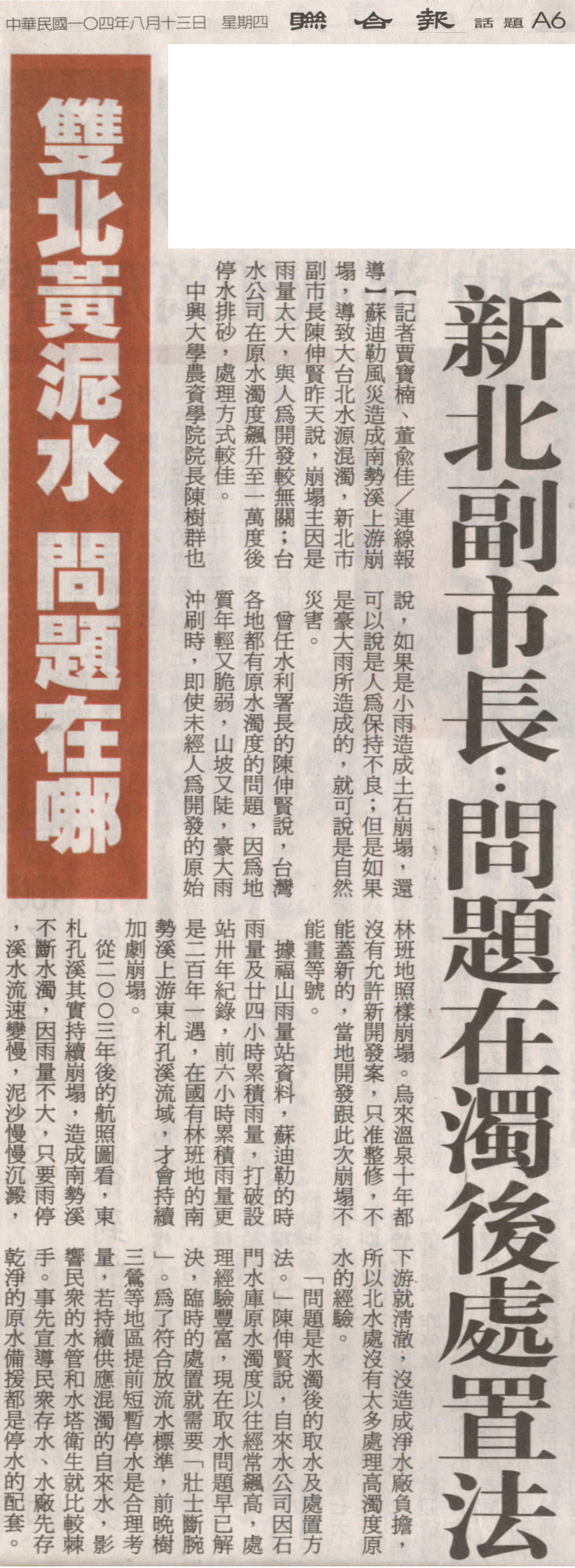 蘇迪勒風災造成南勢溪上游崩塌,導致大台北水源混濁,新北市副市長陳伸賢昨天說,崩塌主因是雨量太大,與人為開發較無關;台水公司在原水濁度飆升至一萬度後停水排砂,處理方式較佳。