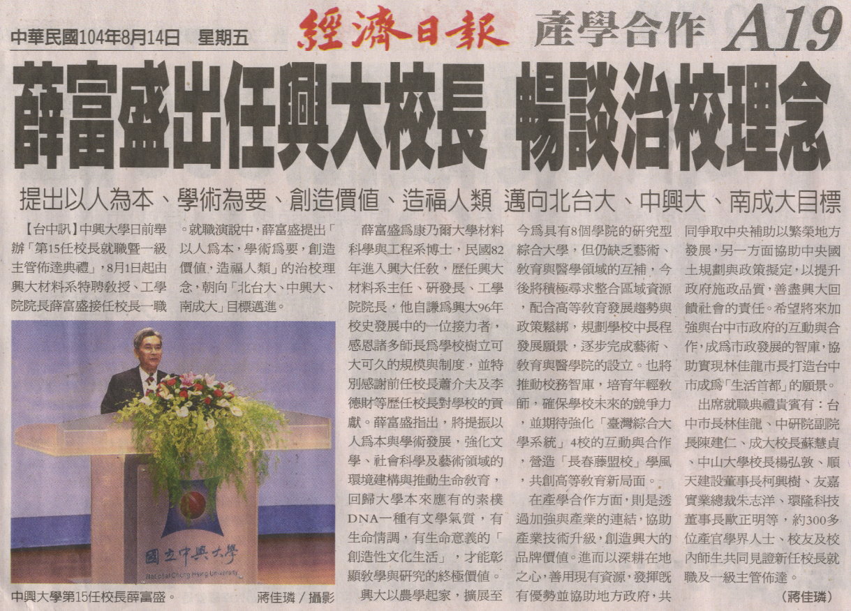 中興大學日前舉辦「第15任校長就職暨一級主管佈達典禮」,8月1日起由興大材料系特聘教授、工學院院長薛富盛接任校長一職。就職演說中,薛富盛提出「以人為本,學術為要,創造價值,造福人類」的治校理念,朝向「北台大、中興大、南成大」目標邁進。