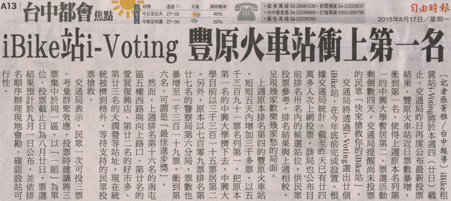 iBike租賃站i-Voting將於本週四(廿日)截止,交通局昨日再度公布最新投票結果,豐原火車站近日票數暴增,衝到第一名,使得上週原本名列第一的中興大學暫居第二。票選活動剩倒數四天,交通局提醒尚未投票的民眾「快來搶救你的iBike站」。