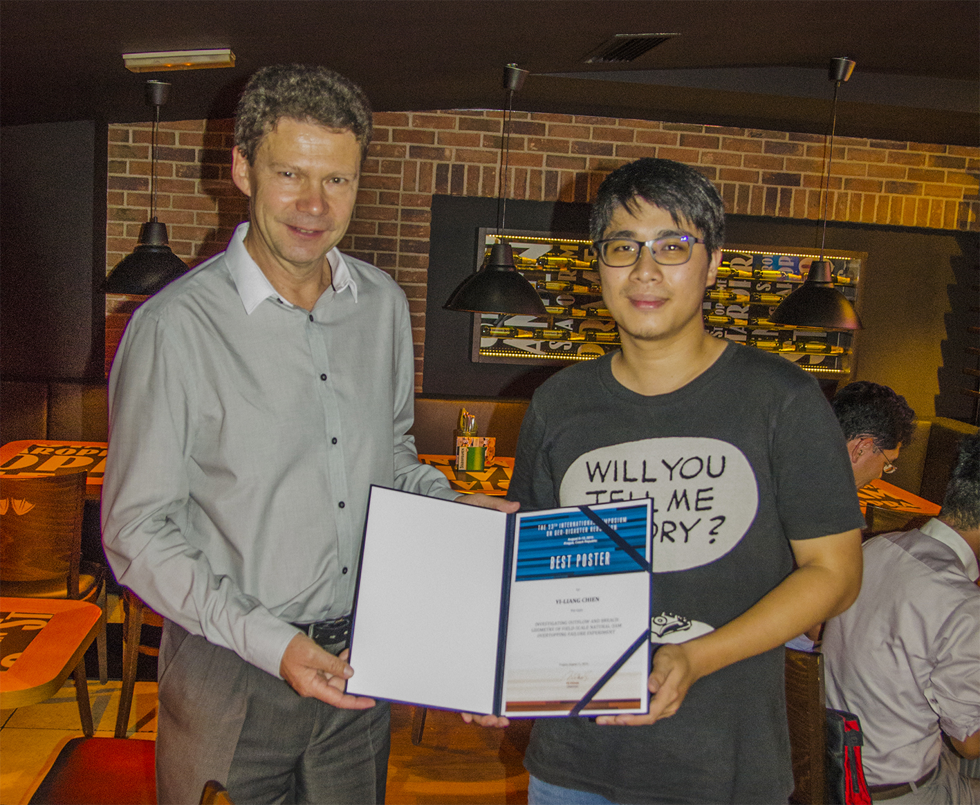 此次在布拉格舉辦的第十三屆地質災害減災研討會(The 13th International Symposium on Geo-disaster Reduction)著重於洪水及土石流災害,總共有來自全球近兩百位專家學者與會。台灣參與學者不多,主要以台灣大學為主。中興大學僅有簡依亮同學參加,簡同學與指導教授陳樹群所發表的「原型尺寸堰塞湖溢頂潰決實驗」,是全球獨步的現場實驗,每次實驗都經由科技部向全球發佈,許多國際著名學者都曾來台參與實驗或觀摩。該論文原被接受為張貼論文,因此簡同學是以較為輕鬆的心情與會。但大會開幕時即被評選為八篇需上台發表的重要張貼論文,簡同學臨危不亂,以扎實的實驗研究及沈穩的發表論述,獲得與會學者一致肯定。大會在閉幕晚宴,各頒發一位oral and poster論文獎。簡依亮同學在眾多論文中脫穎而出,獲得研討會唯一的張貼論文獎(Best Poster),為台灣爭光,也顯現中興大學在坡地災害領域的學術研究受世界肯定。