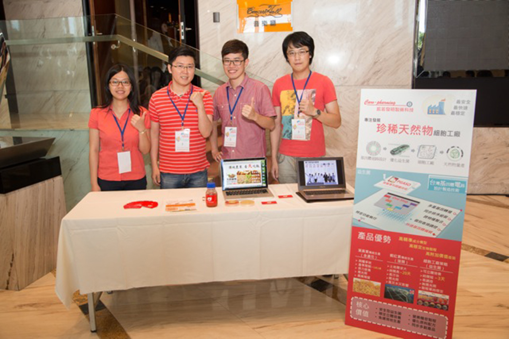 該團隊所建構的「珍稀天然物細胞工廠」,已成功利用天然安全的益生菌作為快速穩定的生物製程,應用於生產高價值、高需求且供應不及之天然類胡蘿蔔素原料,如蝦紅素。相較於傳統的藻類養殖,此方法只需利用少量空間與培養時間即可量產。短程以開發類胡蘿蔔素與蝦紅素為目標,中程以開發生物量產製程與高級天然原料配方為目標,長程則以開發天然抗癌藥物為標的。