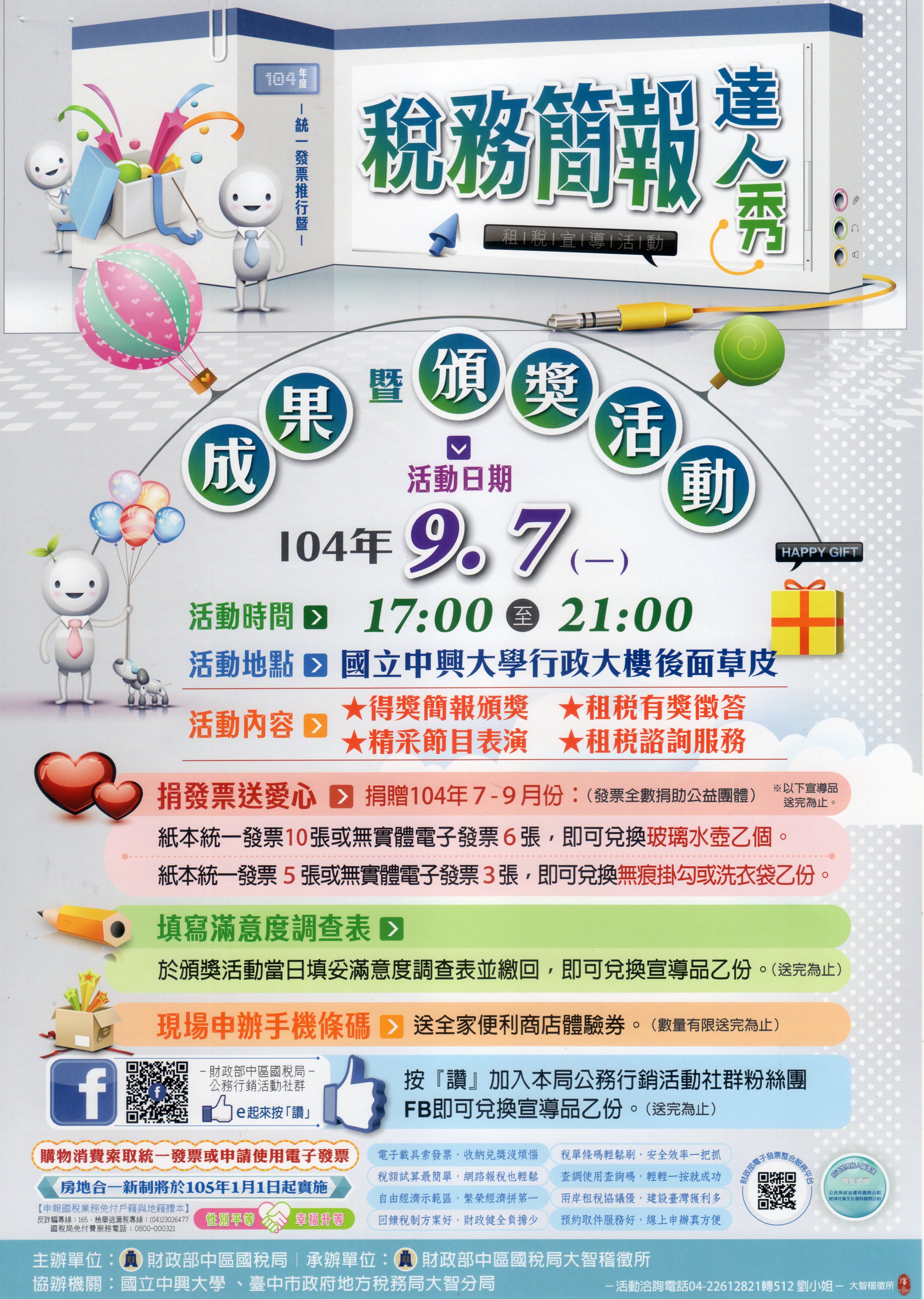 活動內容:得獎簡報頒獎、精采節目表演、租稅有獎徵答、租稅諮詢服務等