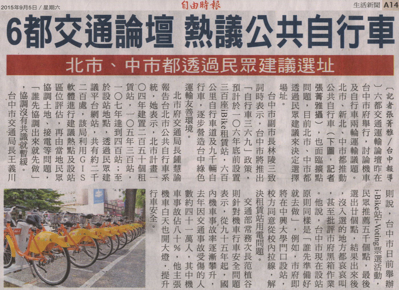 六都交通運輸論壇昨在台中市府舉行,討論機車及自行車兩輪運輸議題。北市、新北、中市都推動公共自行車,也面臨擴點問題,目前北市、中市都透過民眾建議來決定選擇場址。