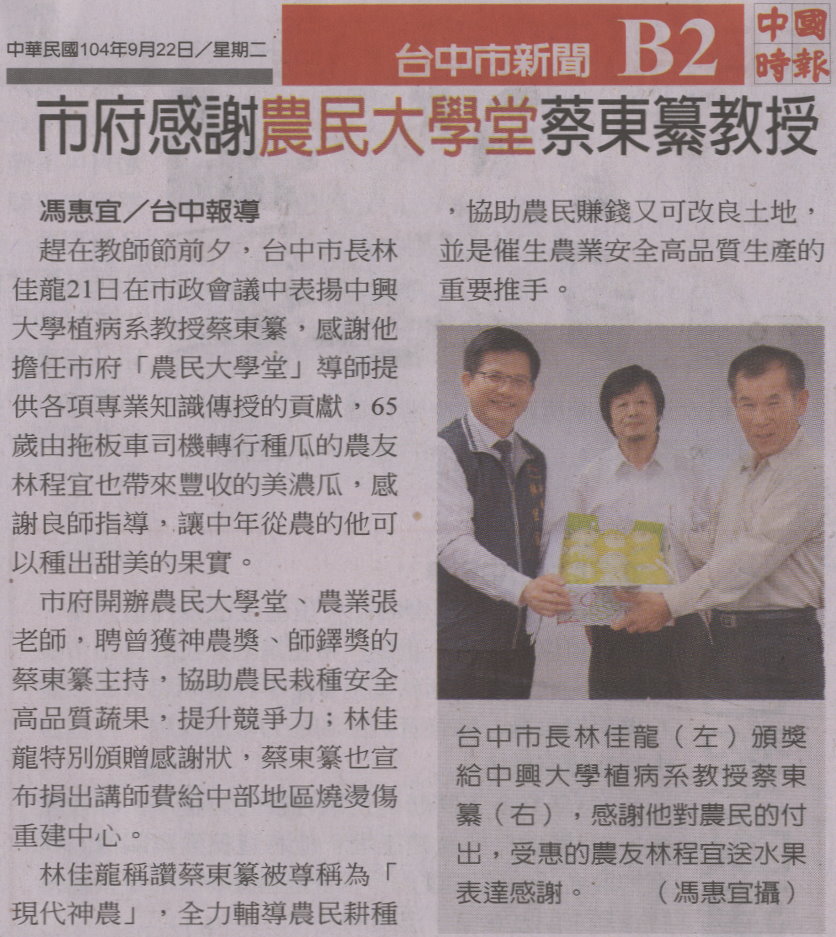 【媒體報導】市府感謝農民大學堂蔡東纂教授