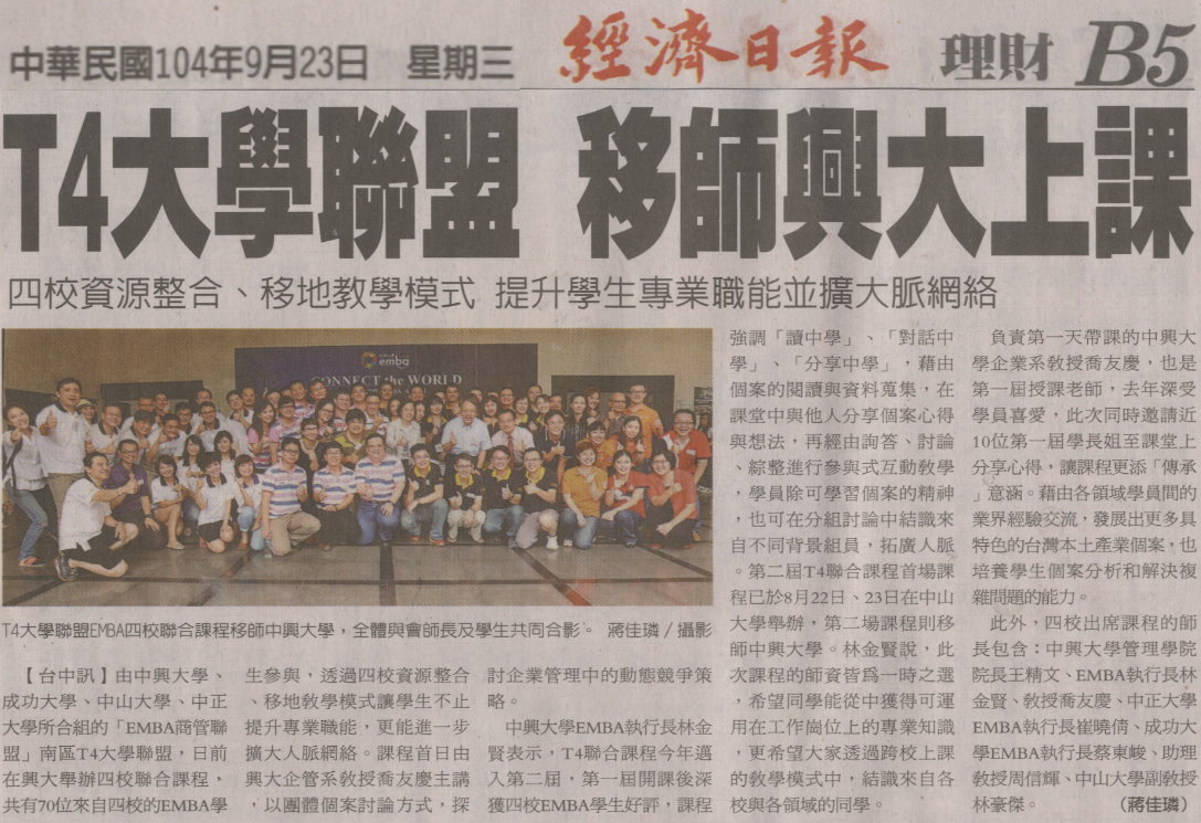 由中興大學、成功大學、中山大學、中正大學所合組的「EMBA商管聯盟」南區T4大學聯盟,日前在興大舉辦四校聯合課程,共有70位來自四校的EMBA學生參與,透過四校資源整合、移地教學模式讓學生不止提升專業職能,更能進一步擴大人脈網絡。課程首日由興大企管系教授喬友慶主講,以團體個案討論方式,探討企業管理中的動態競爭策略。
