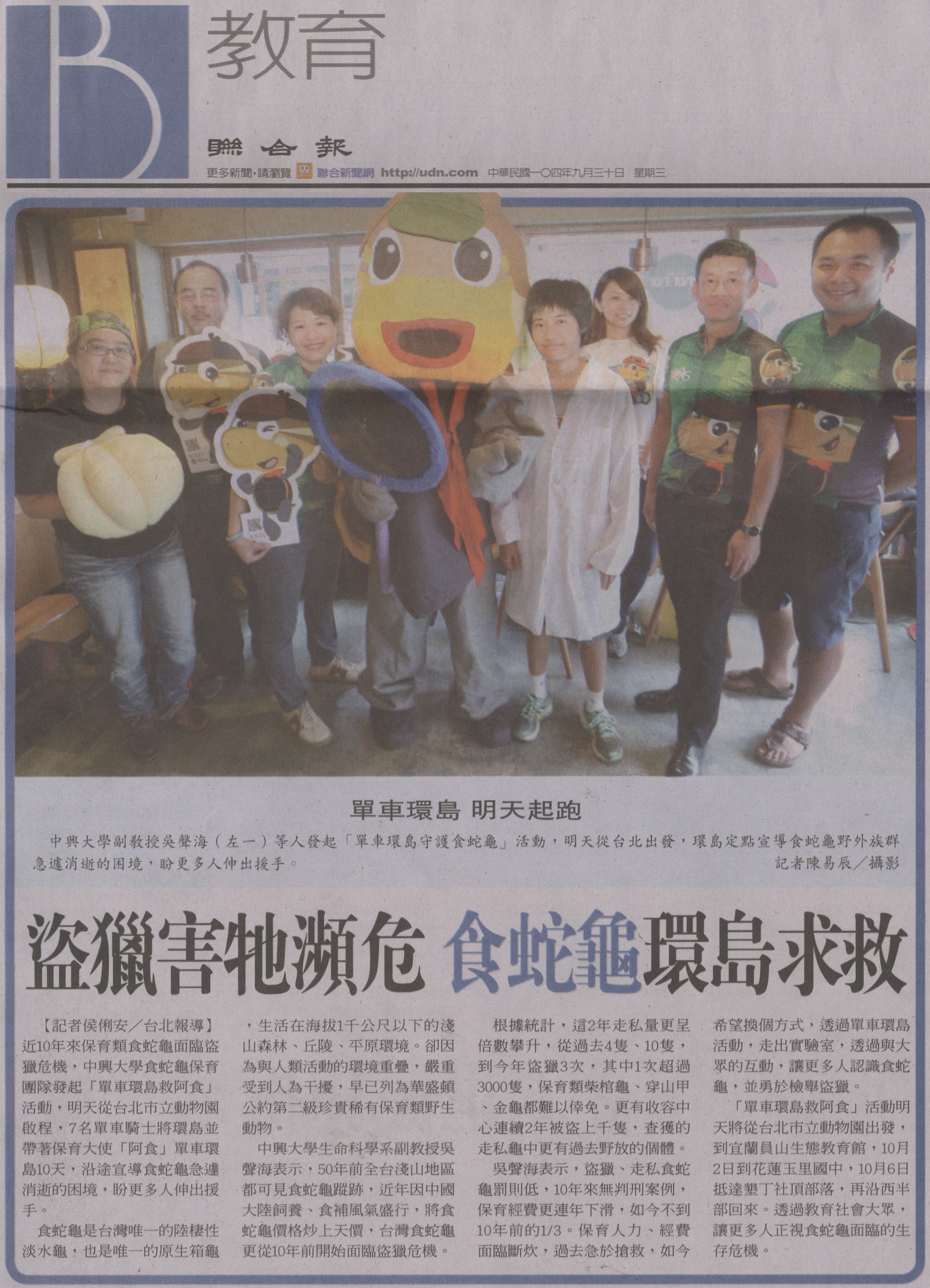 近10年來保育類食蛇龜面臨盜獵危機,中興大學食蛇龜保育團隊發起「單車環島救阿食」活動,明天從台北市立動物園啟程,7名單車騎士將環島並帶著保育大使「阿食」單車環島10天,沿途宣導食蛇龜急遽消逝的困境,盼更多人伸出援手。