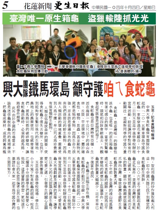 中興大學食蛇龜保育團隊於發起的「二○一五單車環島守護食蛇龜」車隊穿過花東縱谷,於十月二日到玉里高中進修學校辦理宣導活動,盼能讓同學對保育行動關注,並凝聚同學的守護力量。
