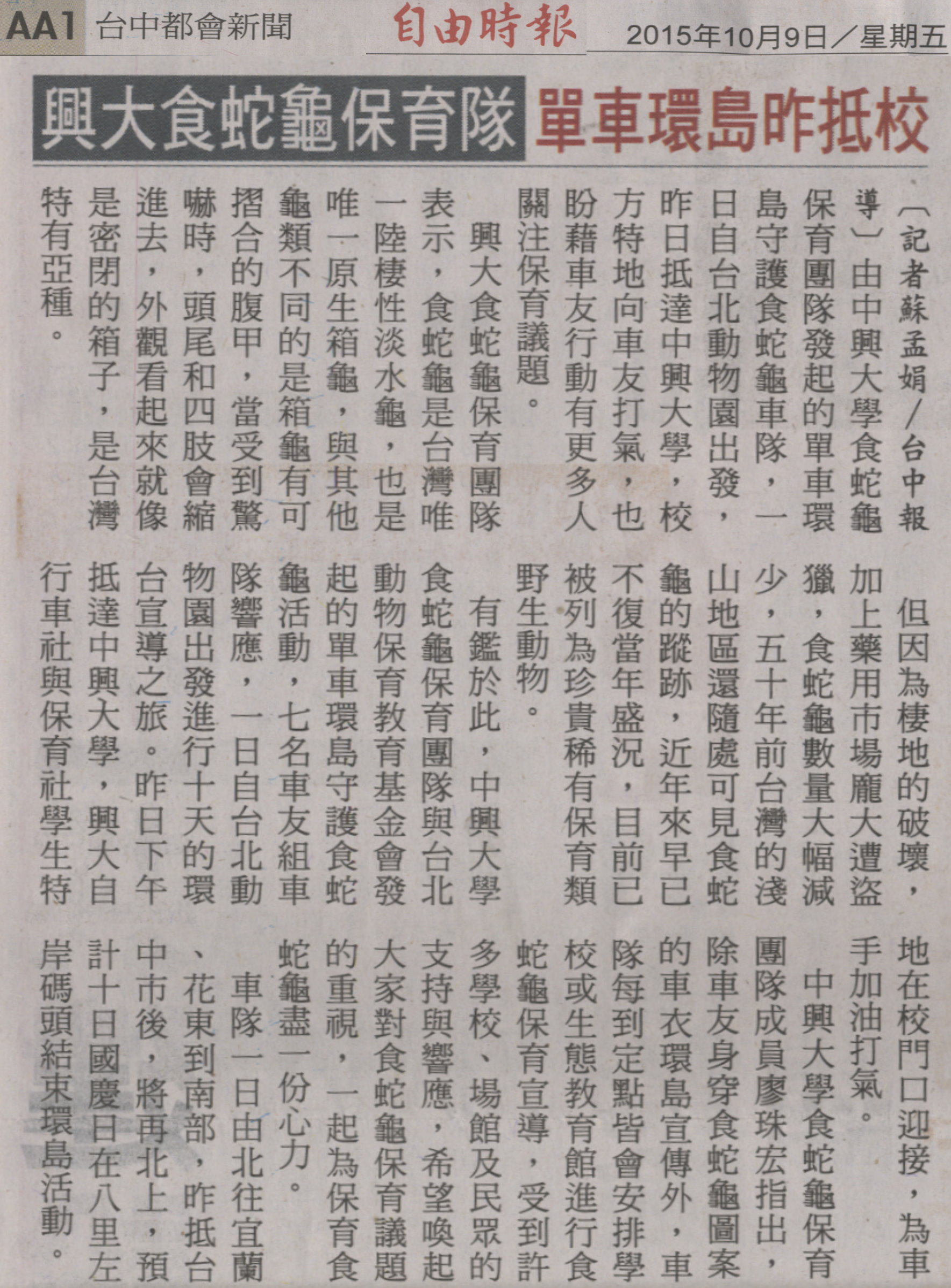 有鑑於此,中興大學食蛇龜保育團隊與台北動物保育教育基金會發起的單車環島守護食蛇龜活動,七名車友組車隊響應,一日自台北動物園出發進行十天的環台宣導之旅。昨日下午抵達中興大學,興大自行車社與保育社學生特地在校門口迎接,為車手加油打氣。