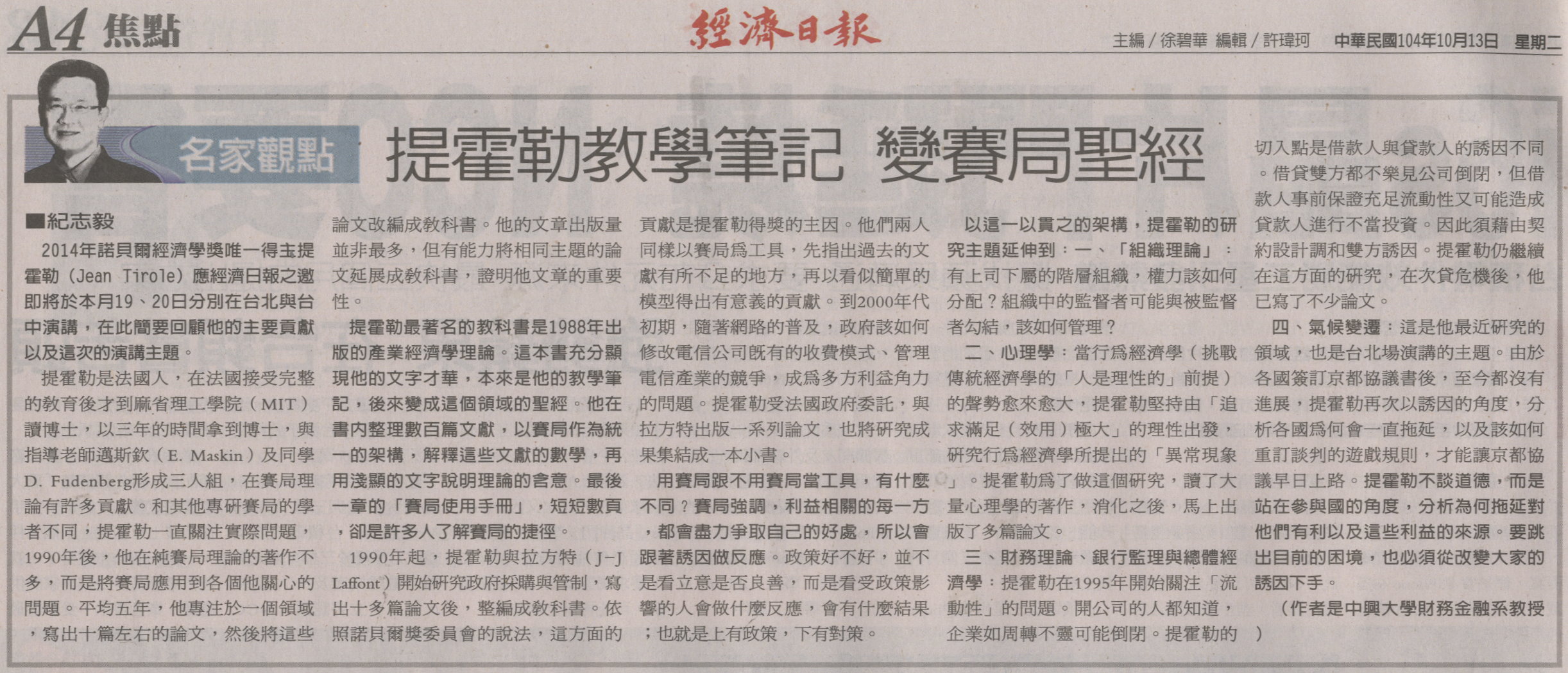 稿源:2015-10-13/經濟日報/A4/焦點/紀志毅/中興大學財務金融系教授